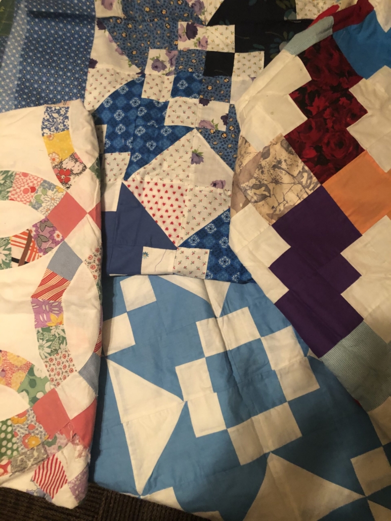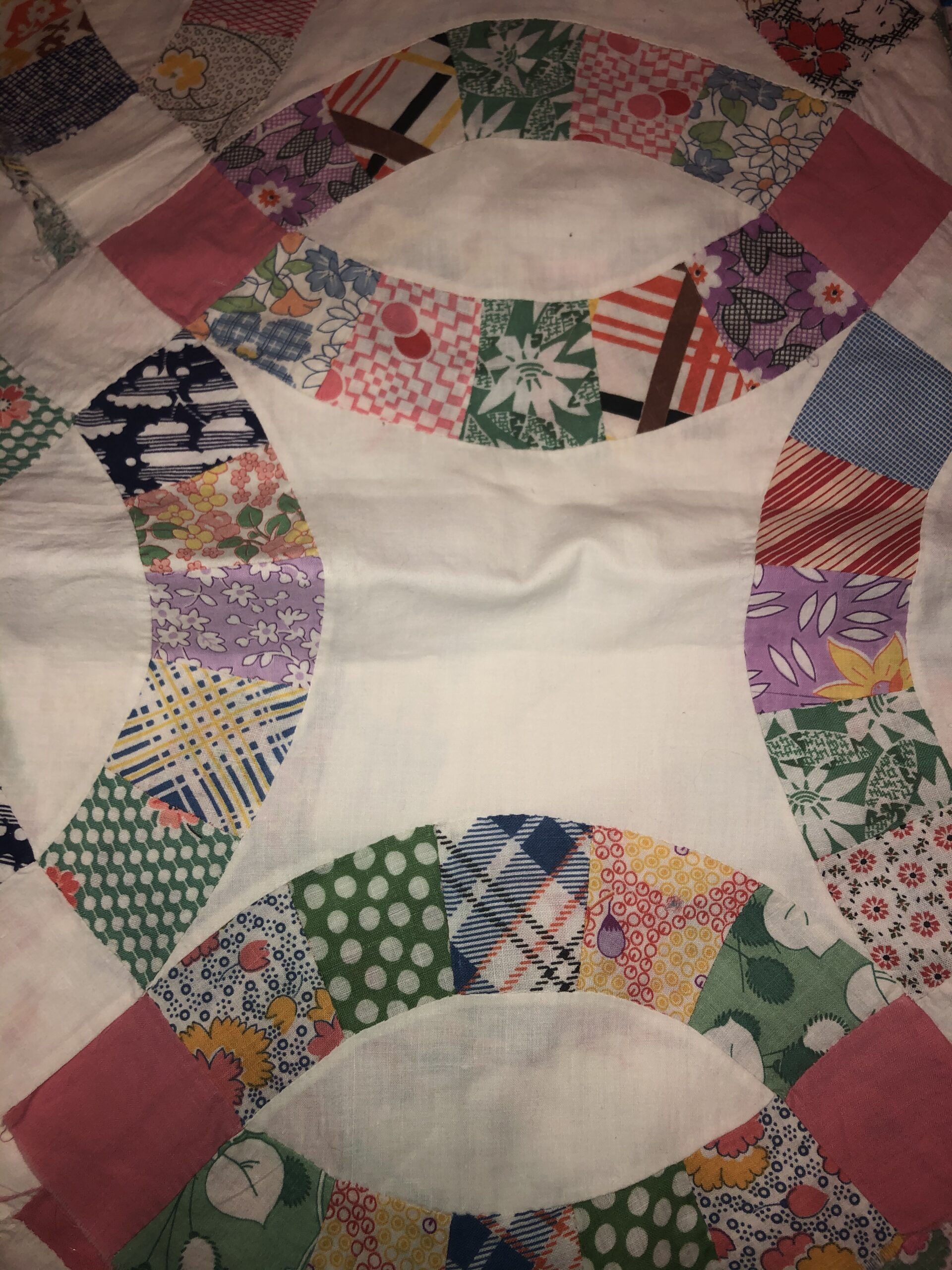 The fabrics are true vintage and the patterns are timeless. My favorite is the double wedding ring. My daughter looked at the quilt and stated, “I was going to say those are 30’s reproduction prints but they are actually 30’s prints.”