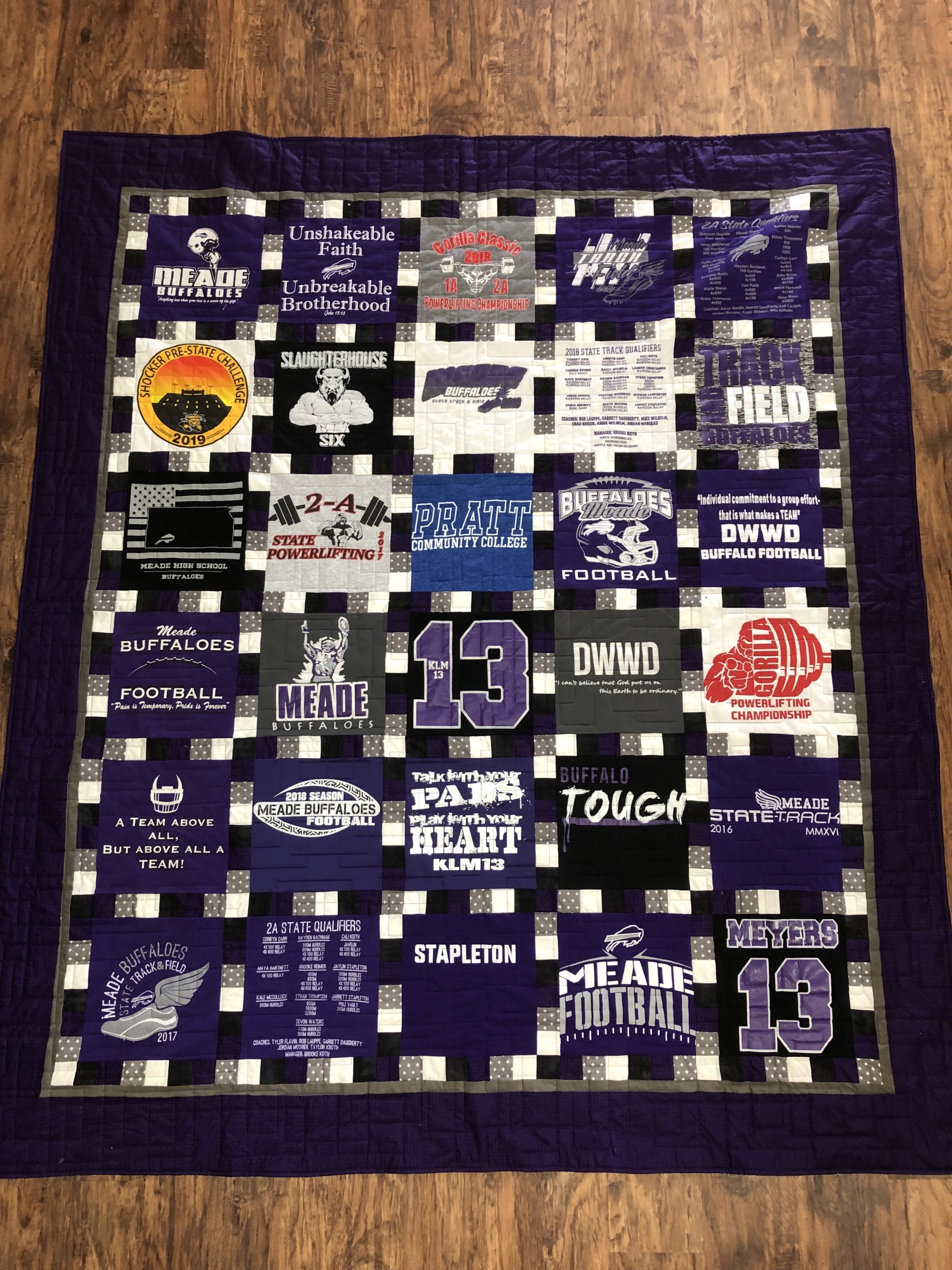 We also offer cornerstone designs, pieced sashing, blocks created from shirts, and puzzles that do not include any fabric other than t-shirts for an additional charge. You can also elect to use a minky (really soft) backing for an added fee.
