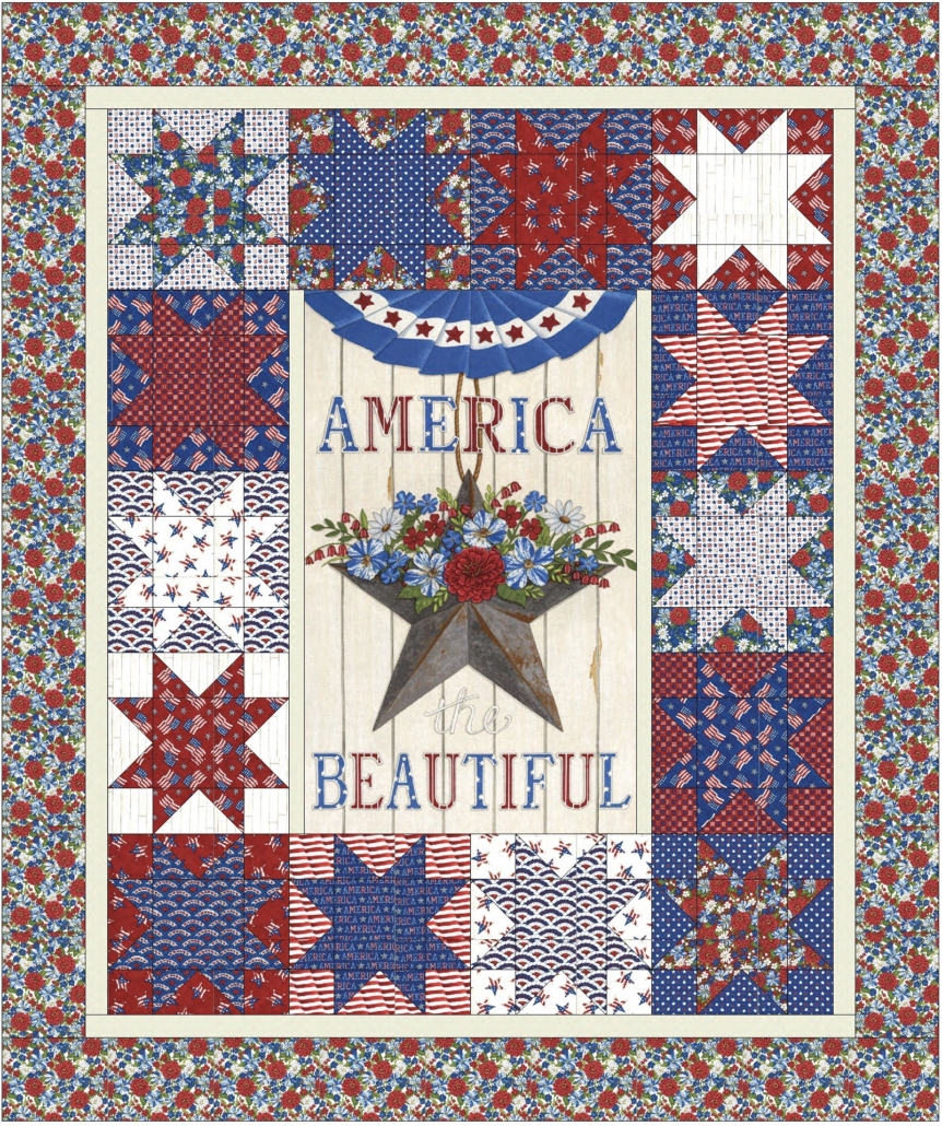 This throw size (62″ x 74″) pattern by Sew Bzzzy Quilt Patterns uses fat quarters and a panel. It features two color ways utilizing the America the Beautiful fabric line by Deb Strain for Moda.