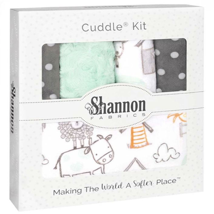Old MacDonald had a… minky fabric quilt! This farm-themed minky plush quilt kit is about as cute as it gets, and features classic farm animals, tractors and barns illustrated in a fun kid-friendly style. Our Bambino Cuddle® Kit Hay, There! includes Luxe Cuddle® Hide Ice, E-I-E-I-O 2 Digital Cuddle® Seaspray and Alotta Dots Cuddle® Graphite for the top, and the binding is Luxe Cuddle® Hide Ice and the backing is E-I-E-I-O Cuddle® Seaspray. This Bambino Cuddle® kit quilt is approximately 28” by 37” and includes a pattern and strips for the quilt top, backing and binding.