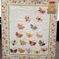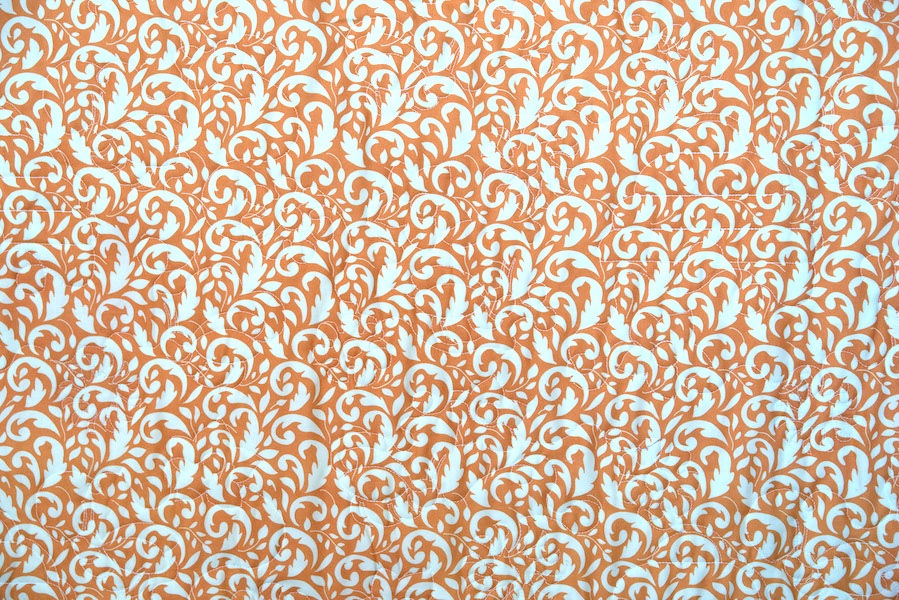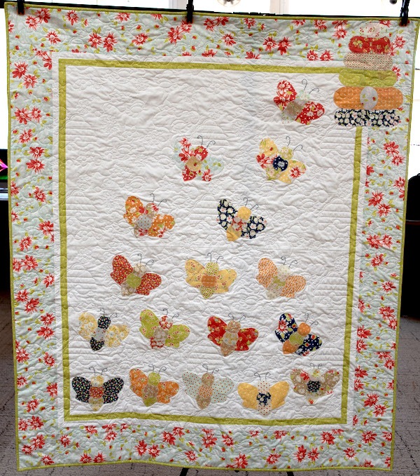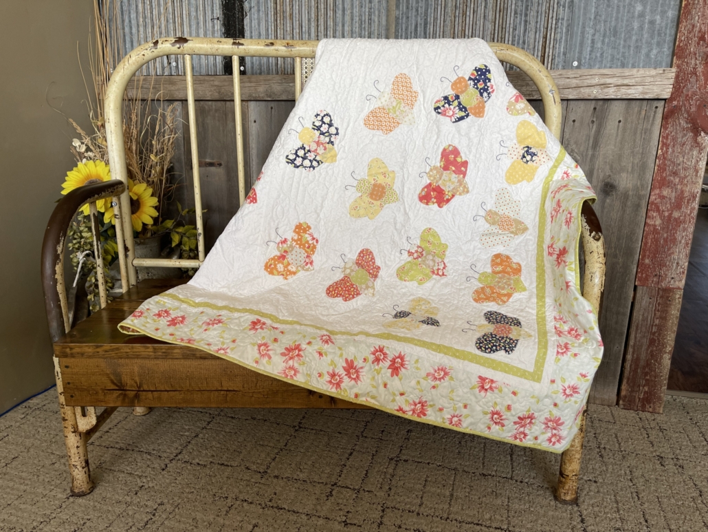 Moda’s Coney Island by Fig Tree is used for the bee and hive appliqué on this summery spectacular. It features an orange and white cotton back from Moda Fig Tree fabric with white bees and honeycomb stitching. 56″ x 65″