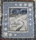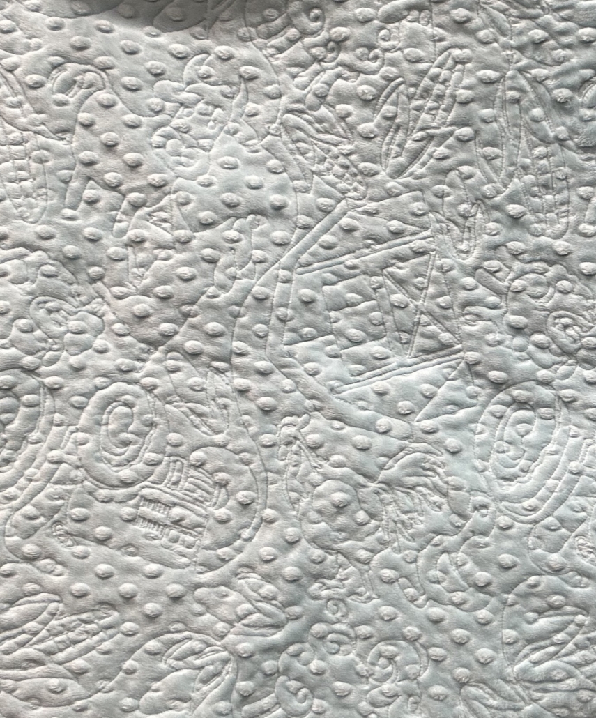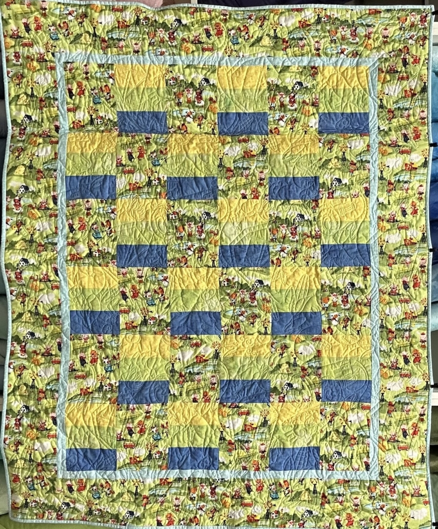 This quilt features Harmony Farm fabric in green, yellow and blue. The top is cotton with a minky (cuddle) soft back in aqua and is machine bound. The quilting is a adorable farm scene in aqua thread. 46.5″ x 57″