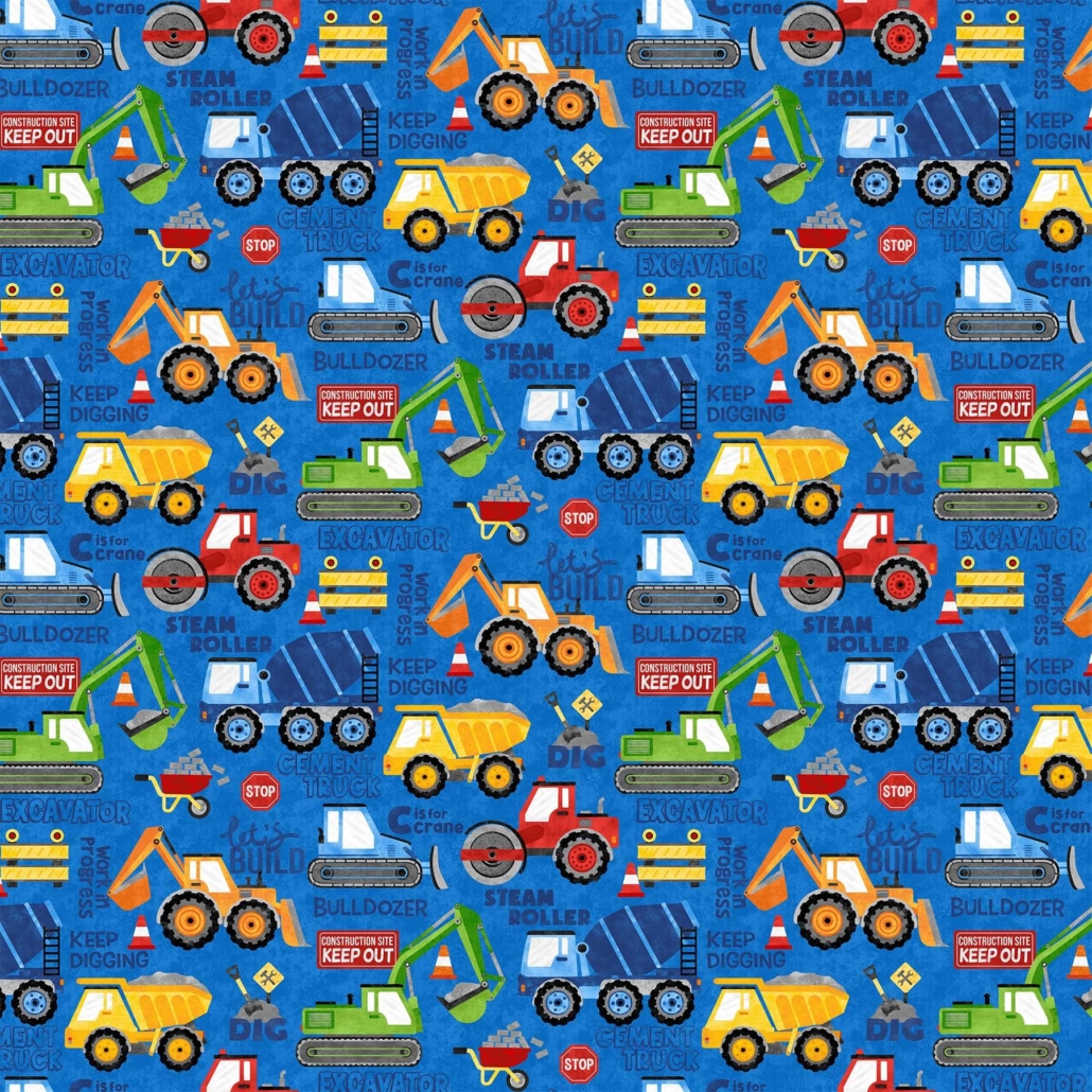 Construction vehicle toss on dark blue from Build Your Own World collection by Northcott