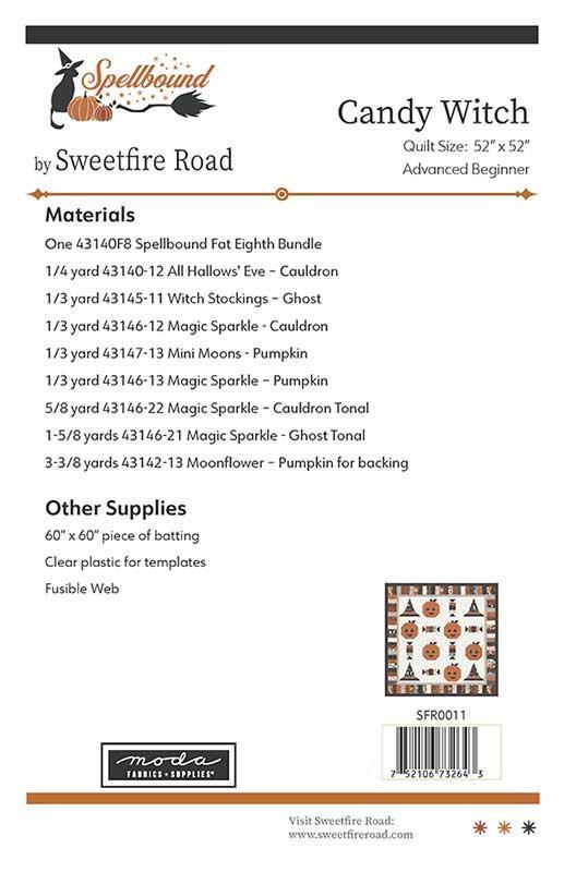 Candy, Witch Hats and Jack-O-Lanterns in oranges, creams and blacks by Sweetfire Road. Fat Eighth friendly and finishes 52″ x 52″