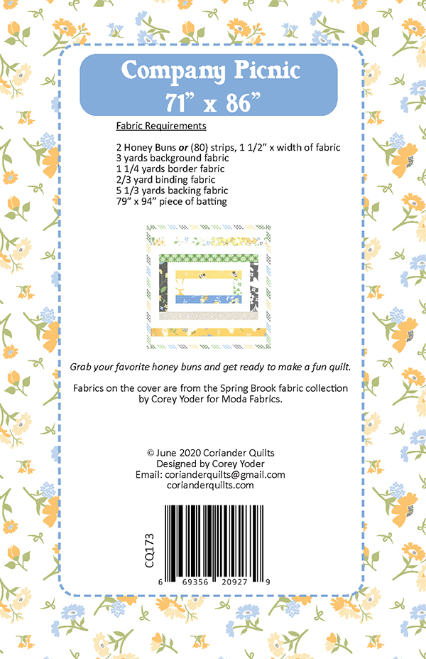 This adorable pattern is by Corey Yoder and is shown in her Spring Brook line by Moda. It is honey bun friendly and finishes at 71″ x 86″