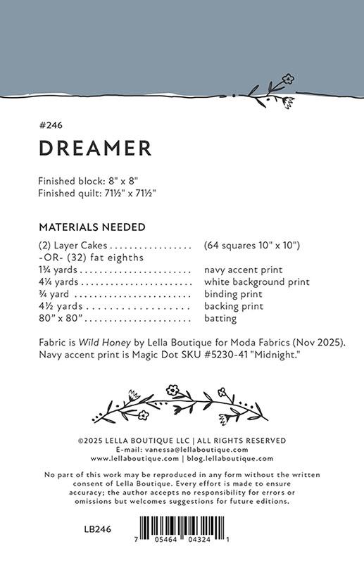 The Dreamer quilt pattern by Lella Boutique is a modern, whimsical design that brings playful movement and gentle charm to your quilt. Featuring a flowing layout of stars, moons, and dreamy shapes, this pattern creates a soft, celestial look that feels both cozy and contemporary. With clear instructions and beginner-friendly construction, Dreamer is perfect for showcasing favorite prints, pastel palettes, or soothing neutrals.