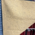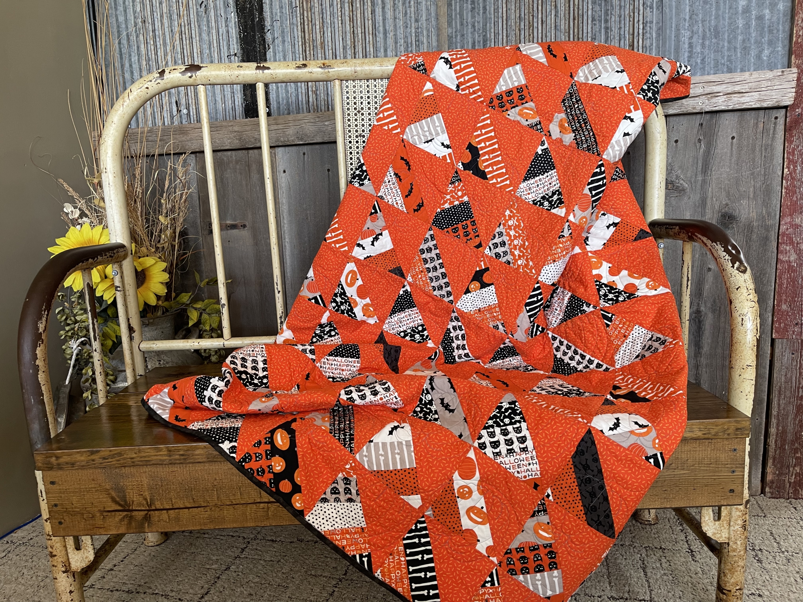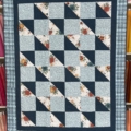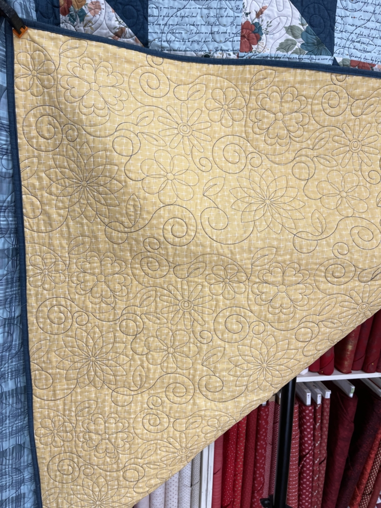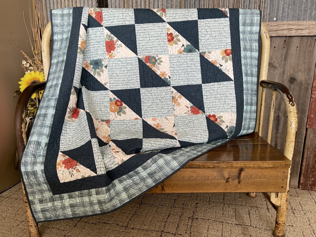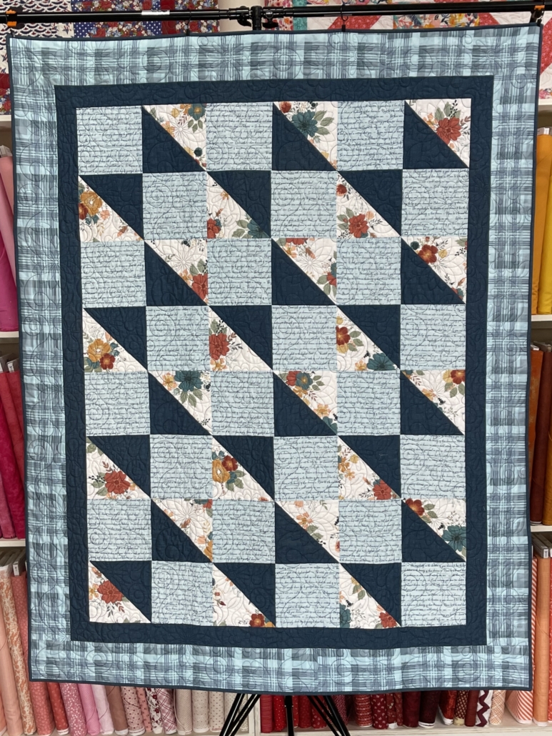 Half-square triangles adorn this lap quilt in blue hues. Cotton yellow backing with bamboo batting. Spring flowers quilting design in navy thread. 59” x 73-1/2”