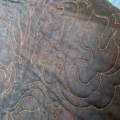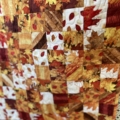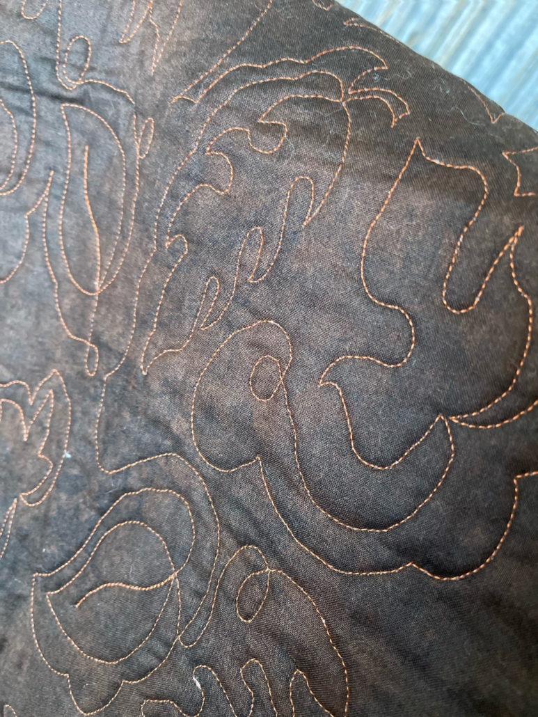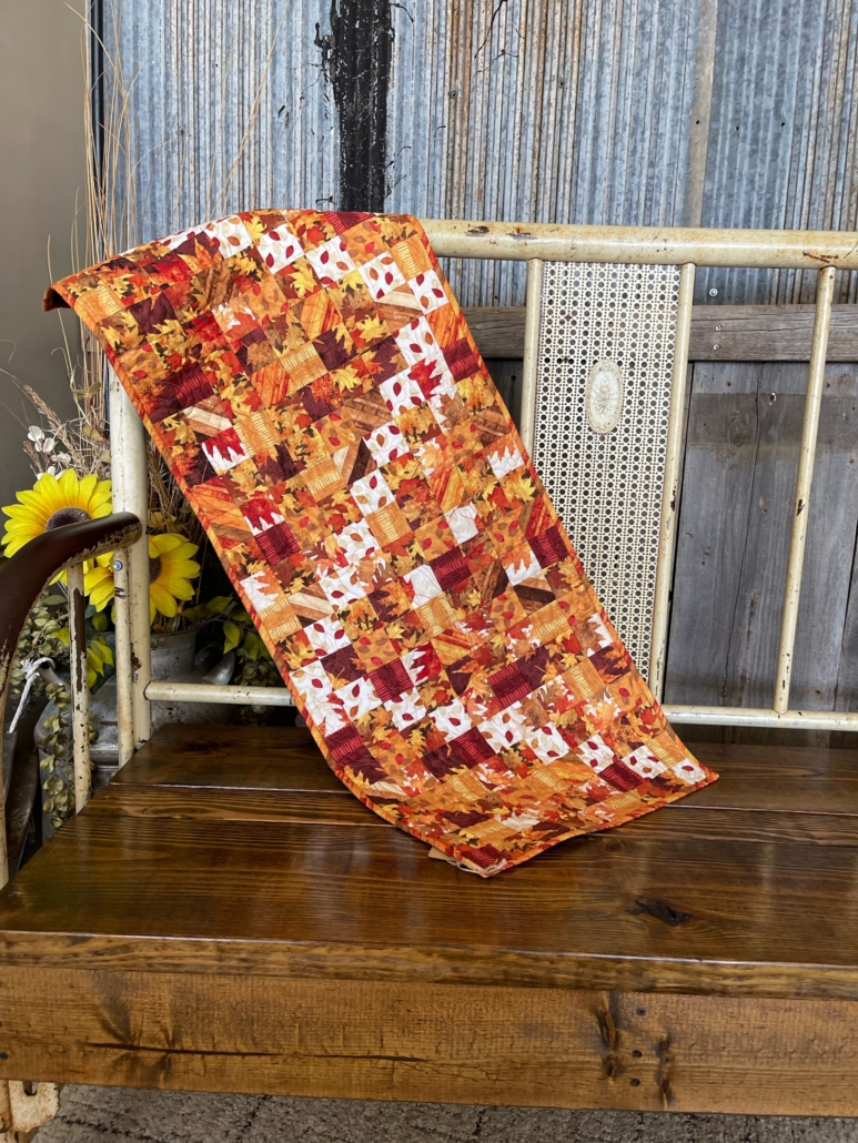 Fall comes alive in this 2” square table runner. Backing is dark brown cotton shadow play with cotton batting. A leaf design in burnt orange thread completes this 17-1/2” x 48” runner