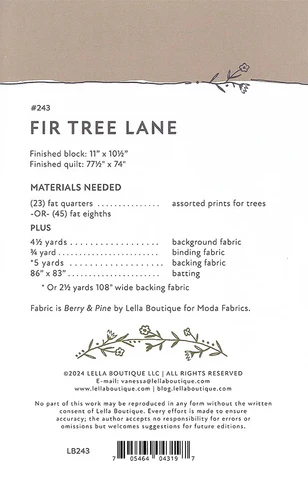The Fir Tree Lane quilt pattern by Lella Boutique, designed by Vanessa Goertzen, is a charming and beginner-friendly design that brings a geometric forest of stylized fir trees to life. Finished at approximately 77½″ × 74″ with individual blocks around 11″ × 10½″, the pattern is fat‑quarter (or fat‑eighth) friendly, allowing for scrappy, mix‑and‑match creativity with your favorite prints. Featuring an easy corner‑triangle technique, it’s quick to piece and perfect for showcasing themed collections or holiday fabrics. Whether you’re aiming for a seasonal quilt in festive hues like greens, reds, and plaids or a year‑round cozy cabin vibe, Fir Tree Lane offers a straightforward and visually delightful project for quilters of all skill levels .