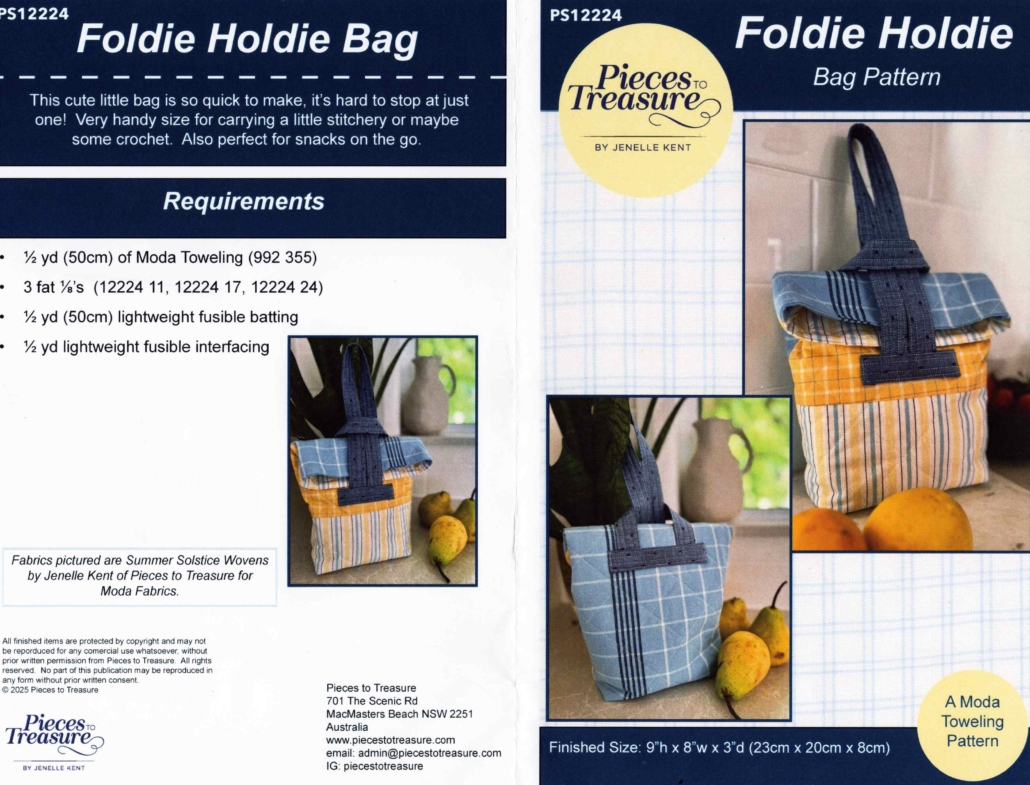 Toweling, fat eighths and pattern to create Pieces To Treasure’s Foldie Holdie bag. Finishes 9 x 8 x 3