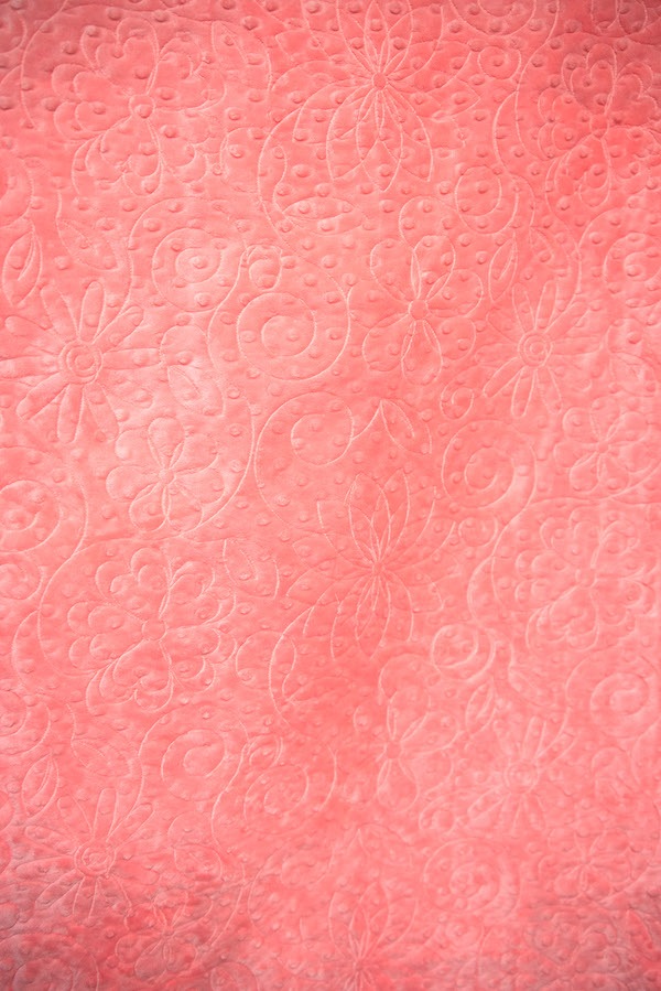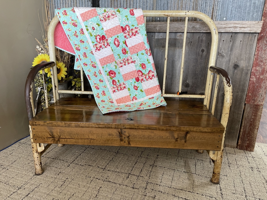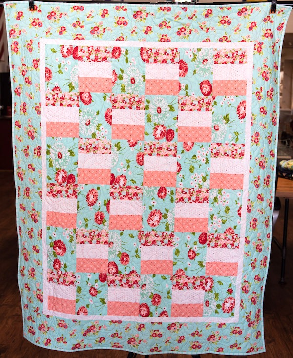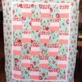 This quilt features Moda’s Bonnie & Camille The Good Life fabric in aqua, coral and red. The top is cotton with a minky (cuddle) soft back in coral. The quilting is a gorgeous floral print in coral thread. 46.5″ x 57″