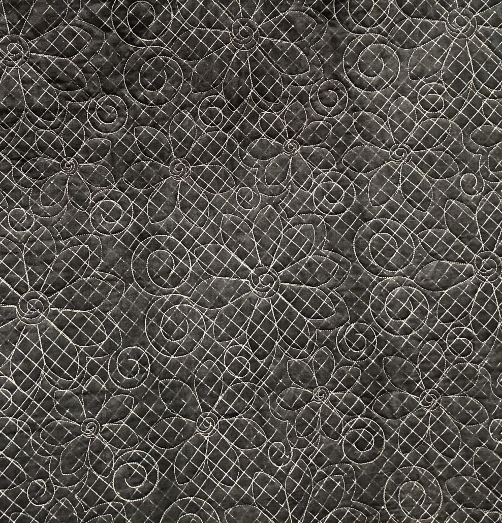 Bees, daisies and dots converge to create this bright and cheery quilt. The backing is black cotton trellis print with hand binding and bamboo batting. 51″ x 66″