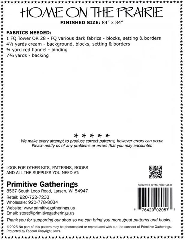 Bring timeless country charm to your sewing room with the Home on the Prairie quilt pattern by Primitive Gatherings. This design features classic patchwork blocks and warm, rustic style inspired by cozy farmhouse living. Perfect for showcasing traditional prints and earthy tones, this pattern creates a nostalgic quilt that feels right at home on any prairie homestead. Finishes 84″ square