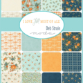 I Love Fall Most of All Layer Cake by Deb Strain for Moda is a cozy, autumn-inspired fabric pack featuring 42 pre-cut 10″ squares. The collection includes warm pumpkin oranges, muted aquas, and a deep “Harvest Night Sky” blue, with charming prints of pumpkins, mums, foliage, plaids, and leaves. Perfect for fall quilts, table runners, pillows, and seasonally themed projects.