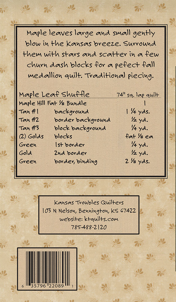 Stars surround maple leaves in this warm and cozy quilt pattern by Lynne Hagmeier of Kansas Troubles Quilters for Moda. It is fat 1/8 friendly and finishes at 74″ square.