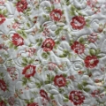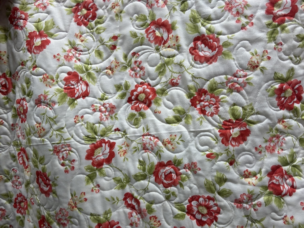 This quilt has a retro feel with floral fabrics in hues of creams, persimmon, orange and green. It is 72″ x 72″ and is quilted with bamboo batting. The backing is a persimmon rose print with cream background and the quilt features hand binding.
