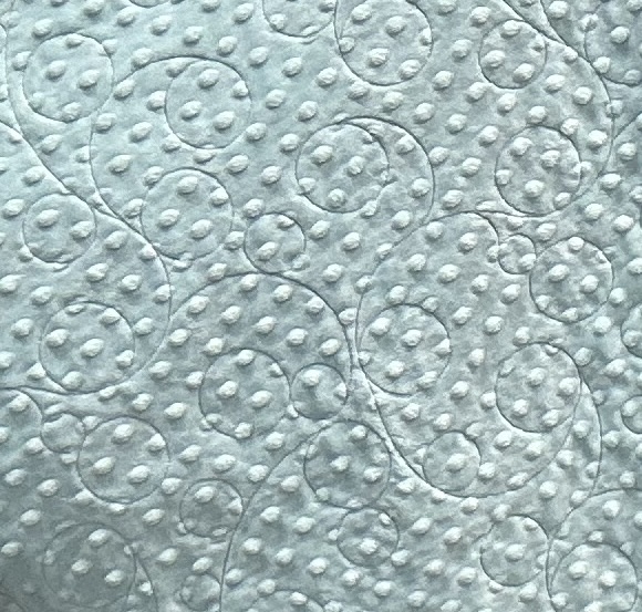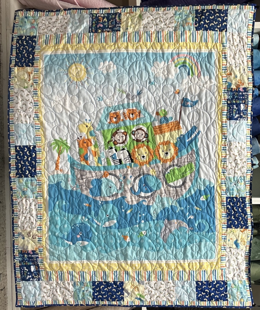 Noah’s Ark panel surrounded by rainbows, stripes, and animals. It features a light blue dimple dot Minky (Cuddle) backing and is hand bound with bamboo batting. 44″ x 55″