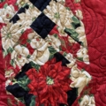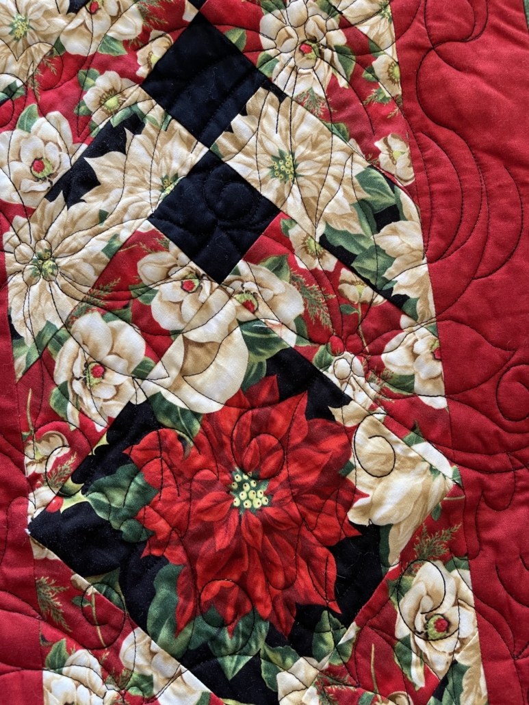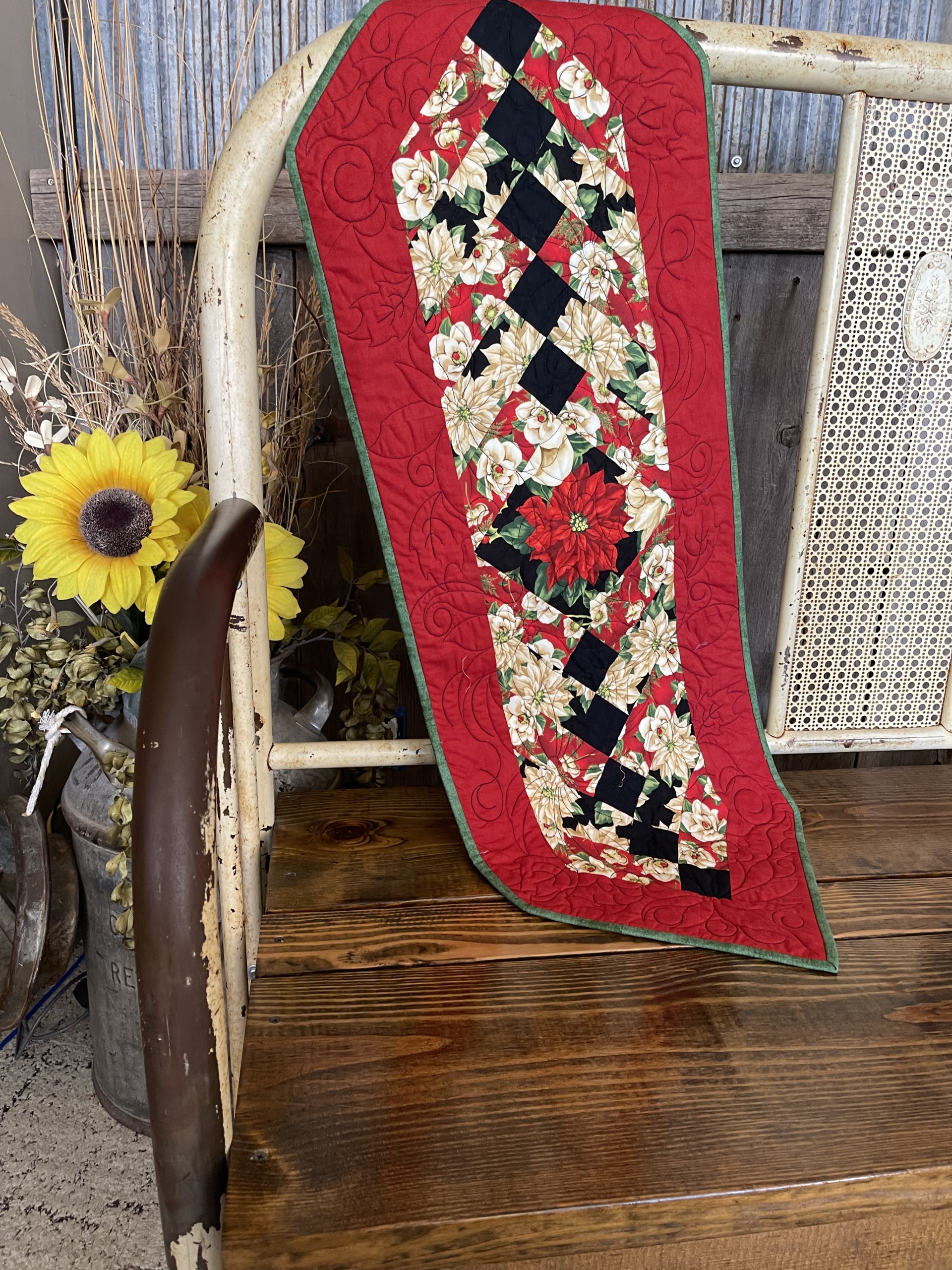 Perfect for any table this poinsettia pattern table runner features a grey snowflake cotton backing and cotton batting. The quilting is in a poinsettia pattern in black thread. 14-1/4” x 45”