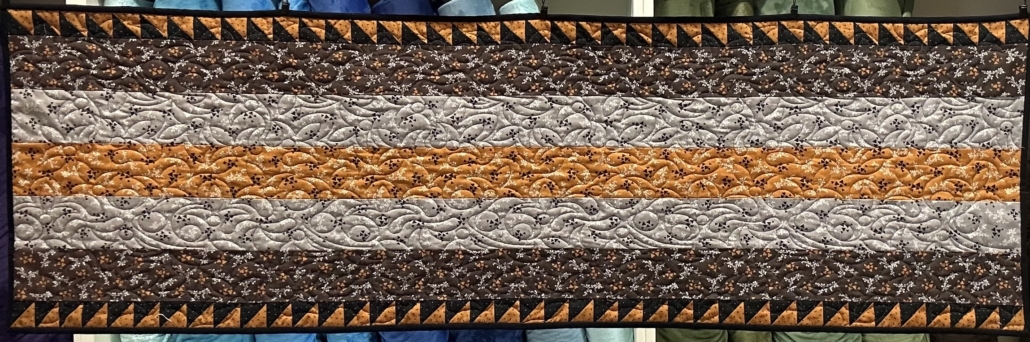 Rust and black triangle borders set off this table runner with brown, grey and rust stripes. It has a grey leaf print cotton back, is hand bound and is quilted with bamboo batting. 18″ x 58″