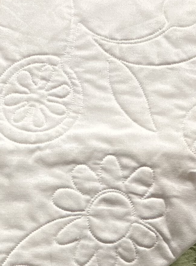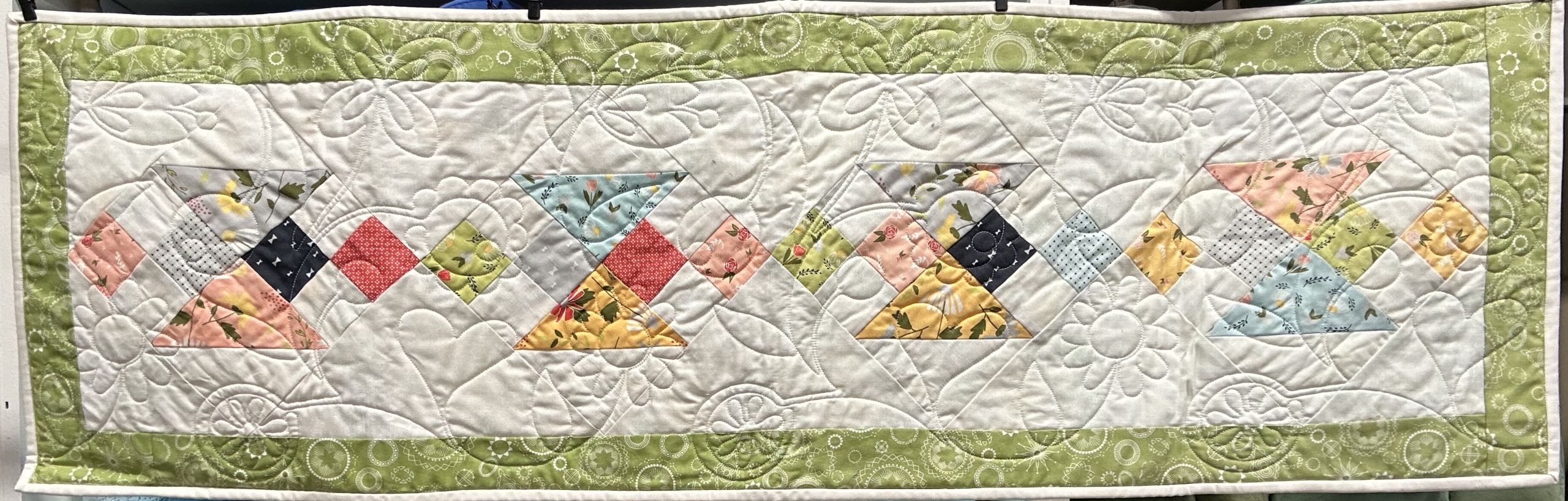 Pastel Shades on cream background with cream cotton back. Machine banding and bamboo batting. 15″ x 48″