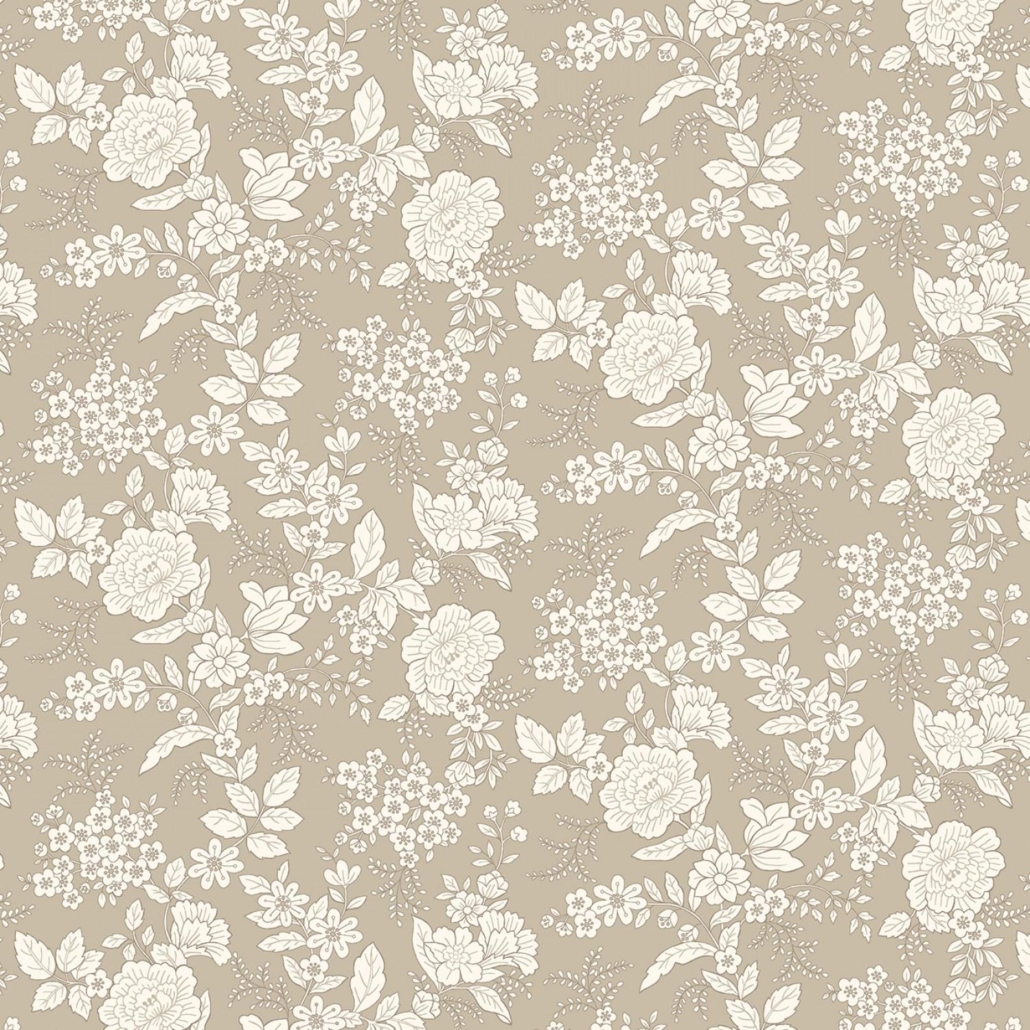 Taupe floral print from the Tranquility collection by Kim Diehl for Henry Glass. 44/45″ wide and 100% cotton