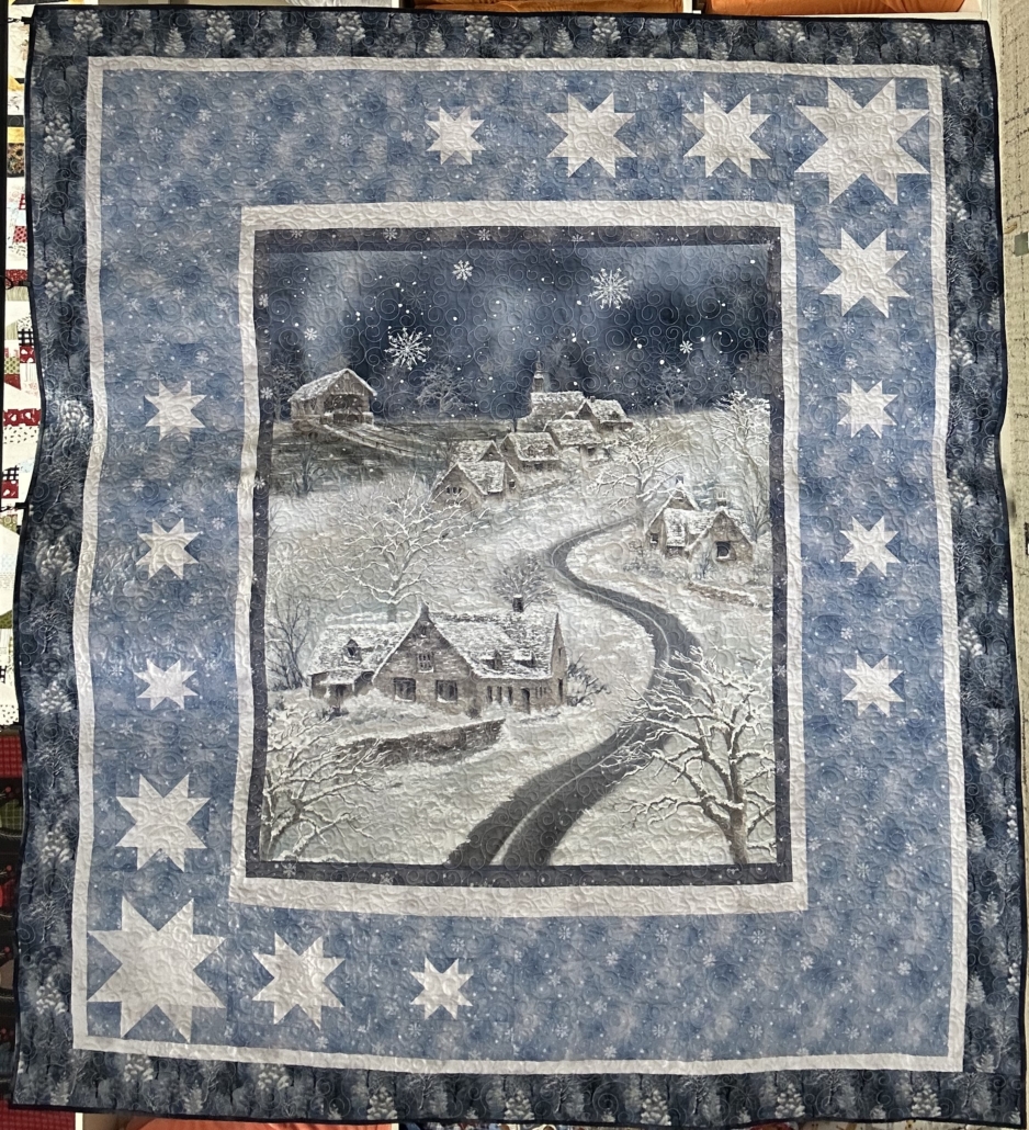 Gorgeous winter scene in soft blues and cream featuring a textured panel surrounded by snowflakes. It has a blue tonal flannel back, is hand bound and bamboo batting. 60.5″ x 68.5″