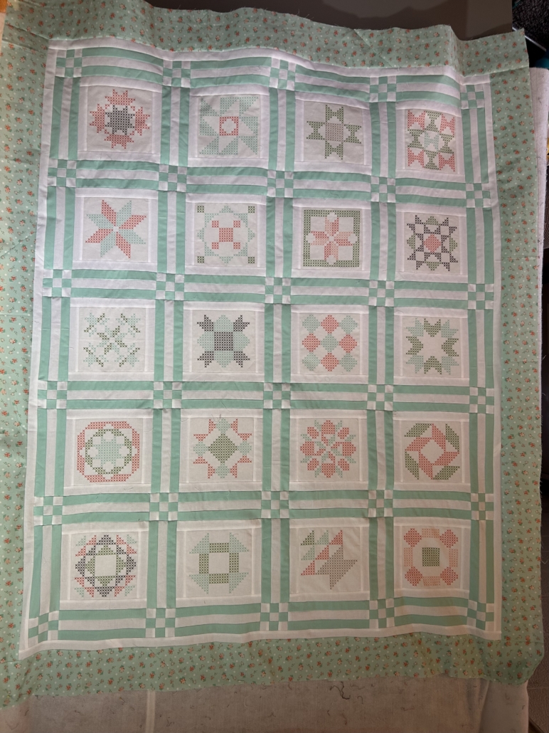 This kit features fabric from Abloom by Corey Yoder for Moda. It features a cross stitch panel that can be left faux or cross stitched. The quilt finishes 59″ x. 70.5″. The kit includes the pattern and fabric for the top and binding.